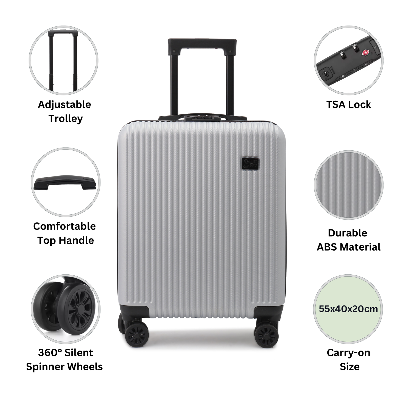 Dydis: 55x40x20cm, kas leidžia įsinešti lagaminą į Ryanair, Wizzair, Airbaltic ir kitas avialinijas, kaip rankinį bagažą.