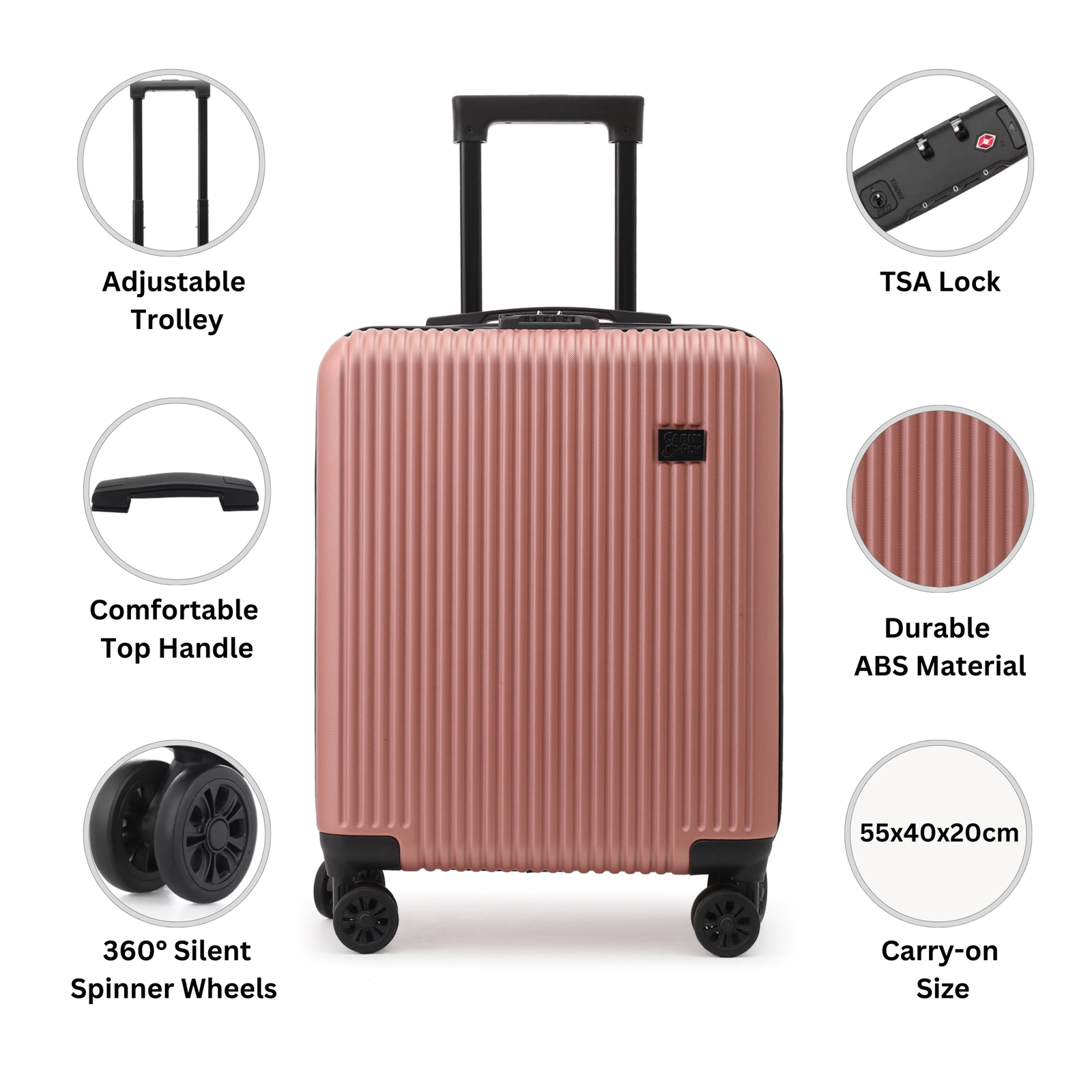 Dydis: 55x40x20cm, kas leidžia įsinešti lagaminą į Ryanair, Wizzair, Airbaltic ir kitas avialinijas, kaip rankinį bagažą.